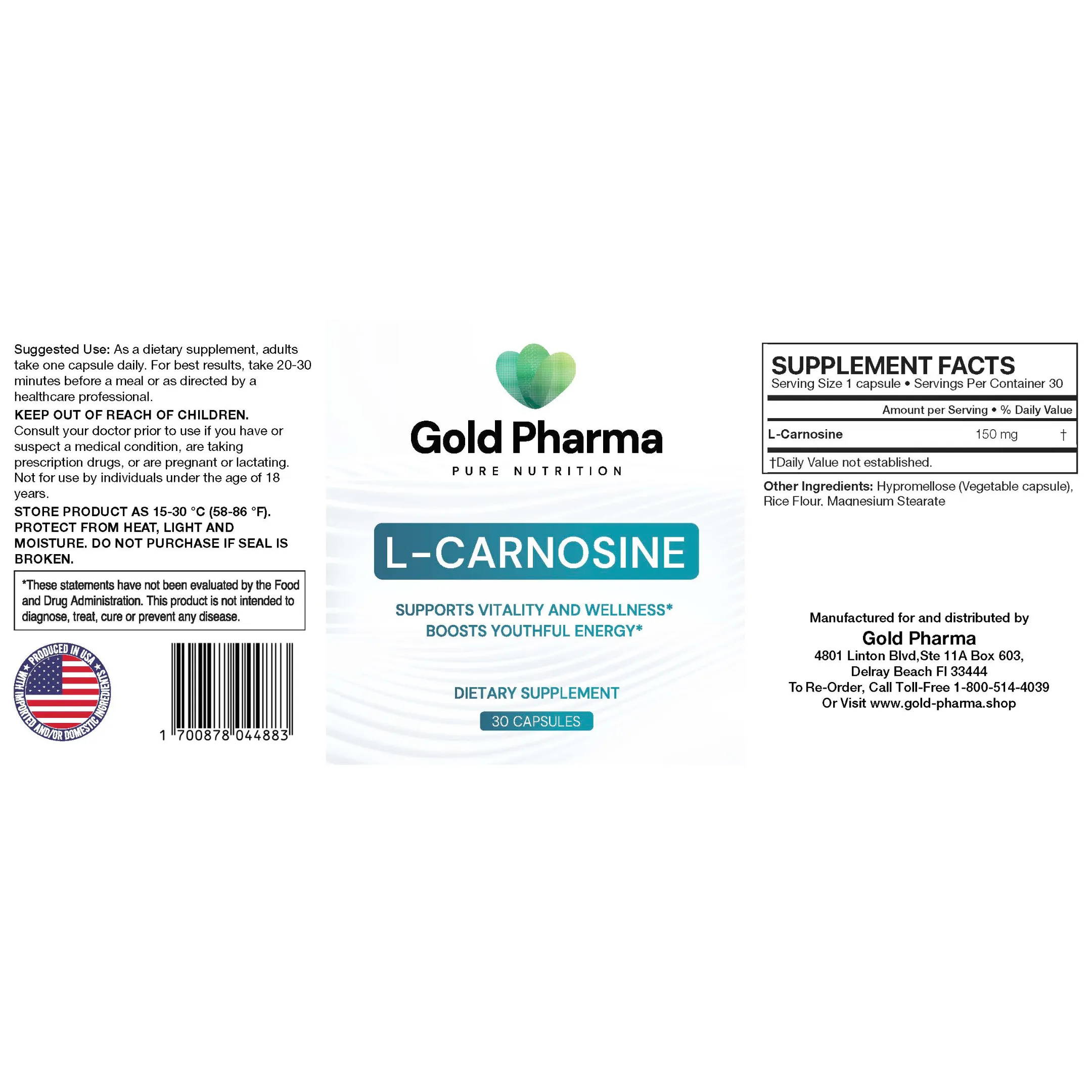 L-Carnosine by Gold Pharma is a high-quality supplement that supports cellular health and promotes anti-aging benefits. Packed with 150 mg of pure L-Carnosine, this convenient capsule helps maintain energy and vitality.